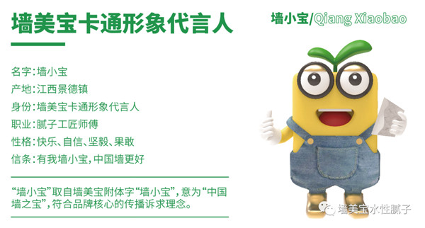 墻小寶是墻美寶的卡通形象代言人。他誕生于景德鎮(zhèn)的工匠世家,他的名字叫“墻小寶”。以方形膩?zhàn)影b為原型作為核心創(chuàng)意,提取了卡通形象識(shí)別人物“小黃人”的造型元素,讓卡通形象自帶識(shí)別性與記憶點(diǎn)。既反映了膩?zhàn)蛹跋嚓P(guān)輔材產(chǎn)品的特色,又呼應(yīng)了墻美寶的設(shè)計(jì)理念。在建材行業(yè)設(shè)計(jì)中率先使用包裝袋作為吉祥物設(shè)計(jì)的創(chuàng)意,是一次創(chuàng)新,“墻小寶”從頭到腳都充滿了含義。